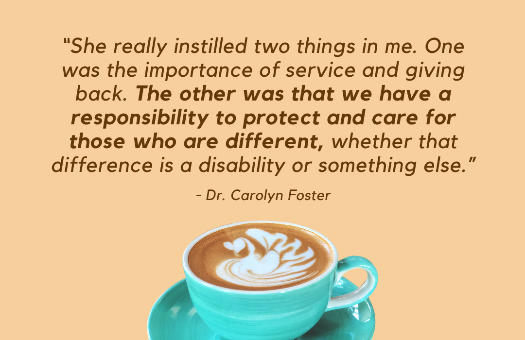 “She really instilled two things in me. One was the importance of service and giving back. The other was that we have a responsibility to protect and care for those who are different, whether that difference is a disability or something else.”